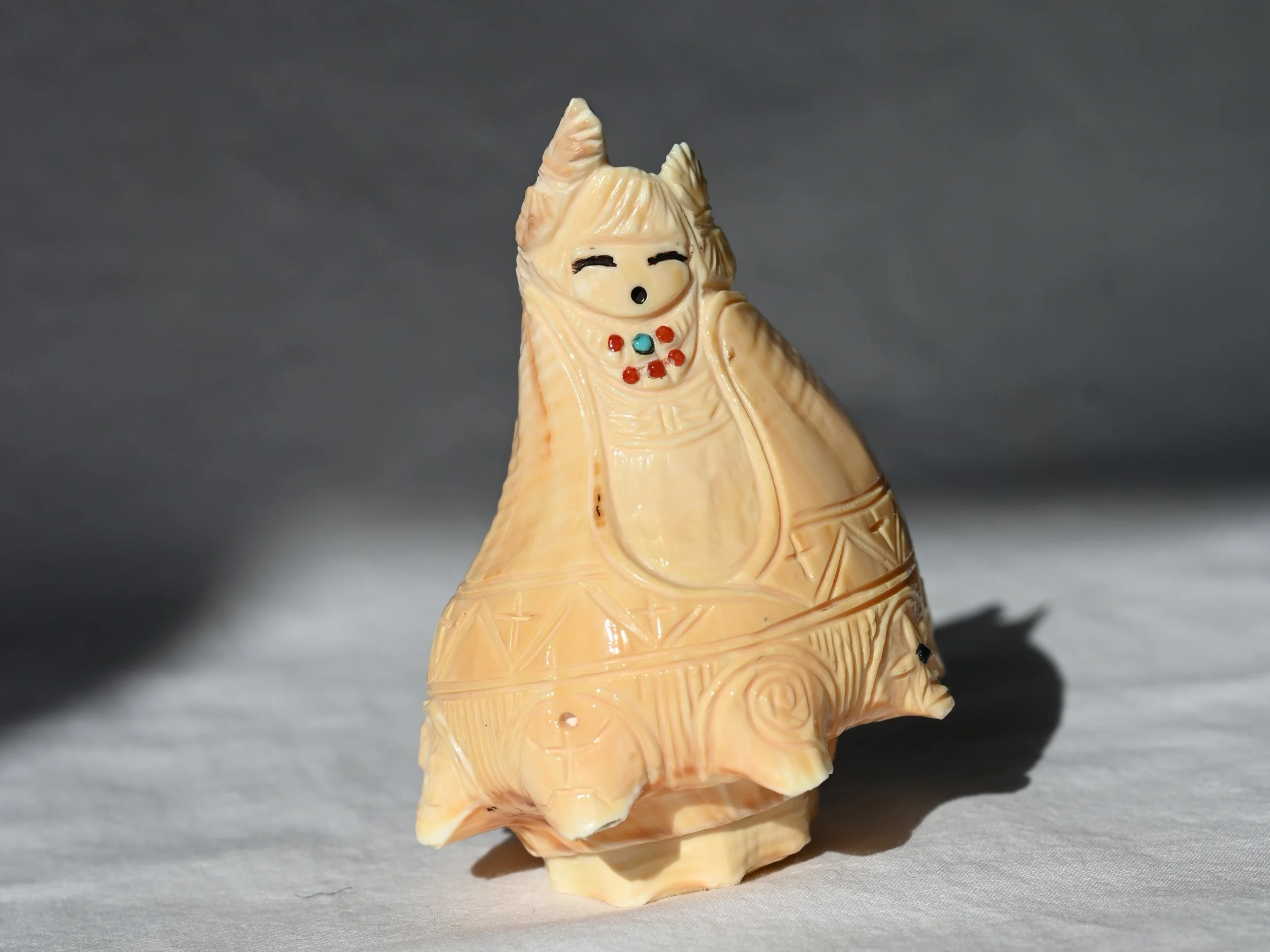 This conch shell channels the sounds and waves of the ocean and added movement to this carved Hopi maiden. The nodules of the shell contain petroglyphs and flowers and the piece is inlaid with red coral and turquoise (date unknown).