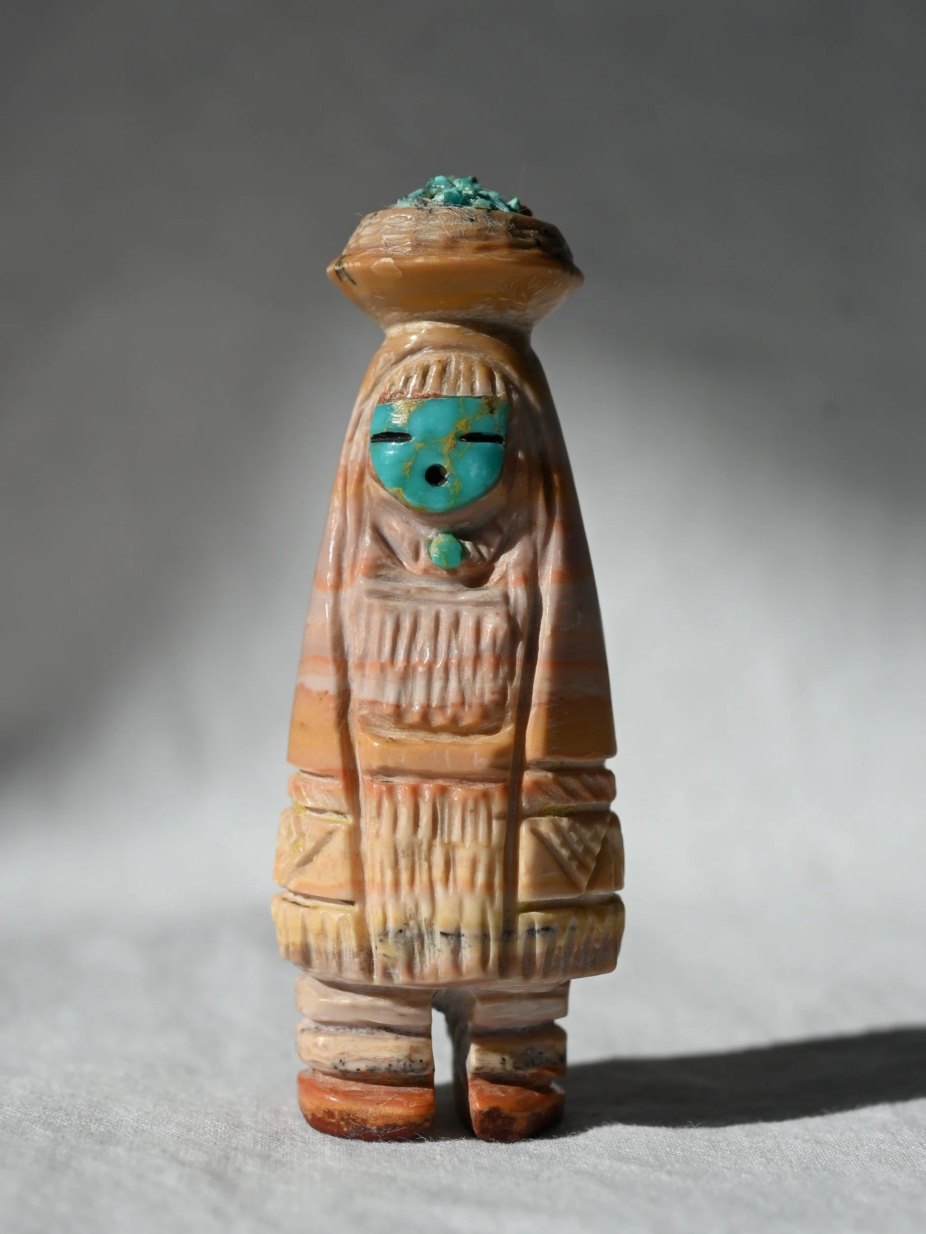 This olla maiden, made by Faye Quandelacy, is carved of Dolomite with intricate detail of her dress and shawl. As an olla maiden, she carries a large water pot on her head, which is inlaid with bright turquoise pieces (date unknown).