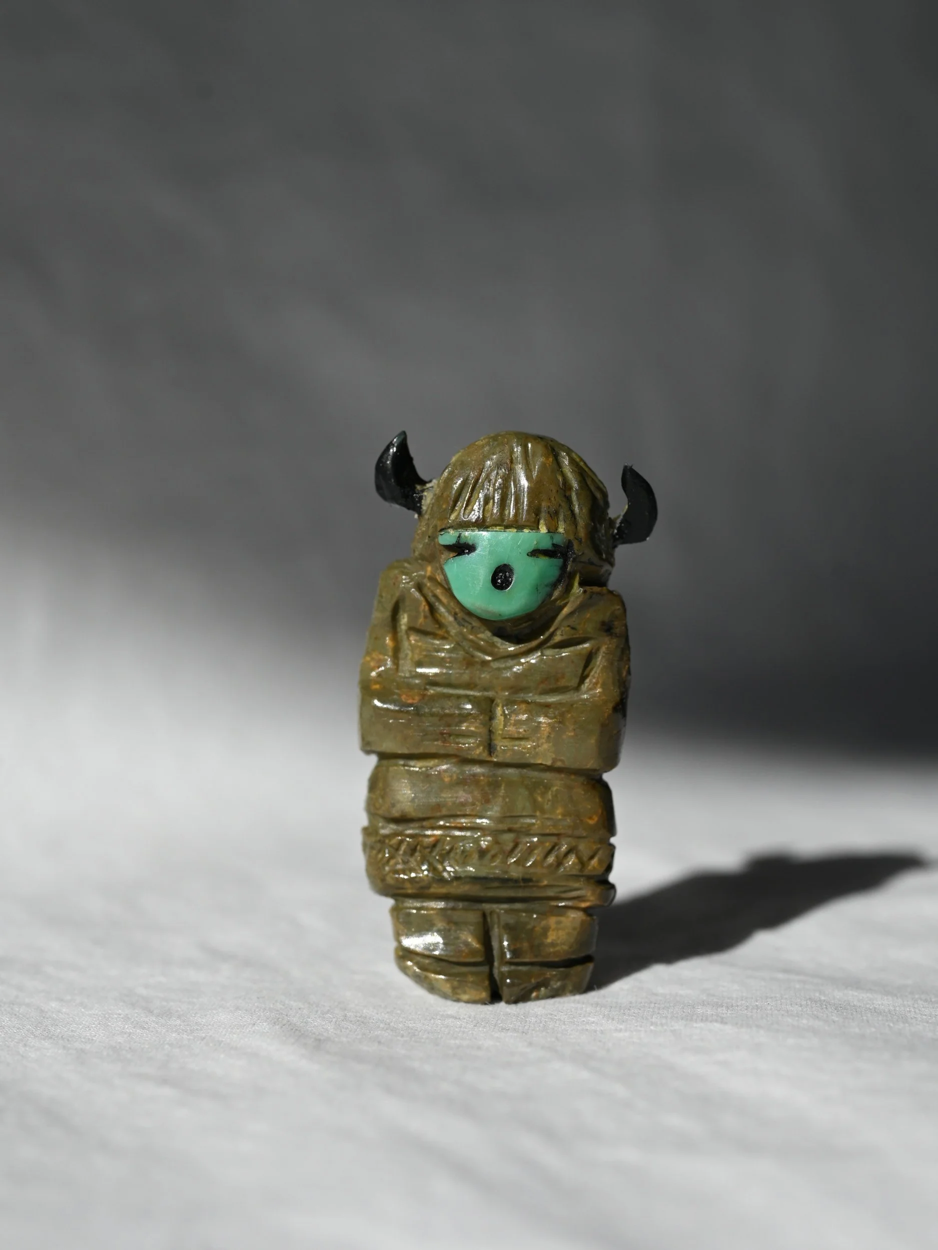 One of the more unique carvings by Faye Quandelacy was her buffalo dancers. This piece was made of an olive green turquoise, with jet black horns (date unknown).